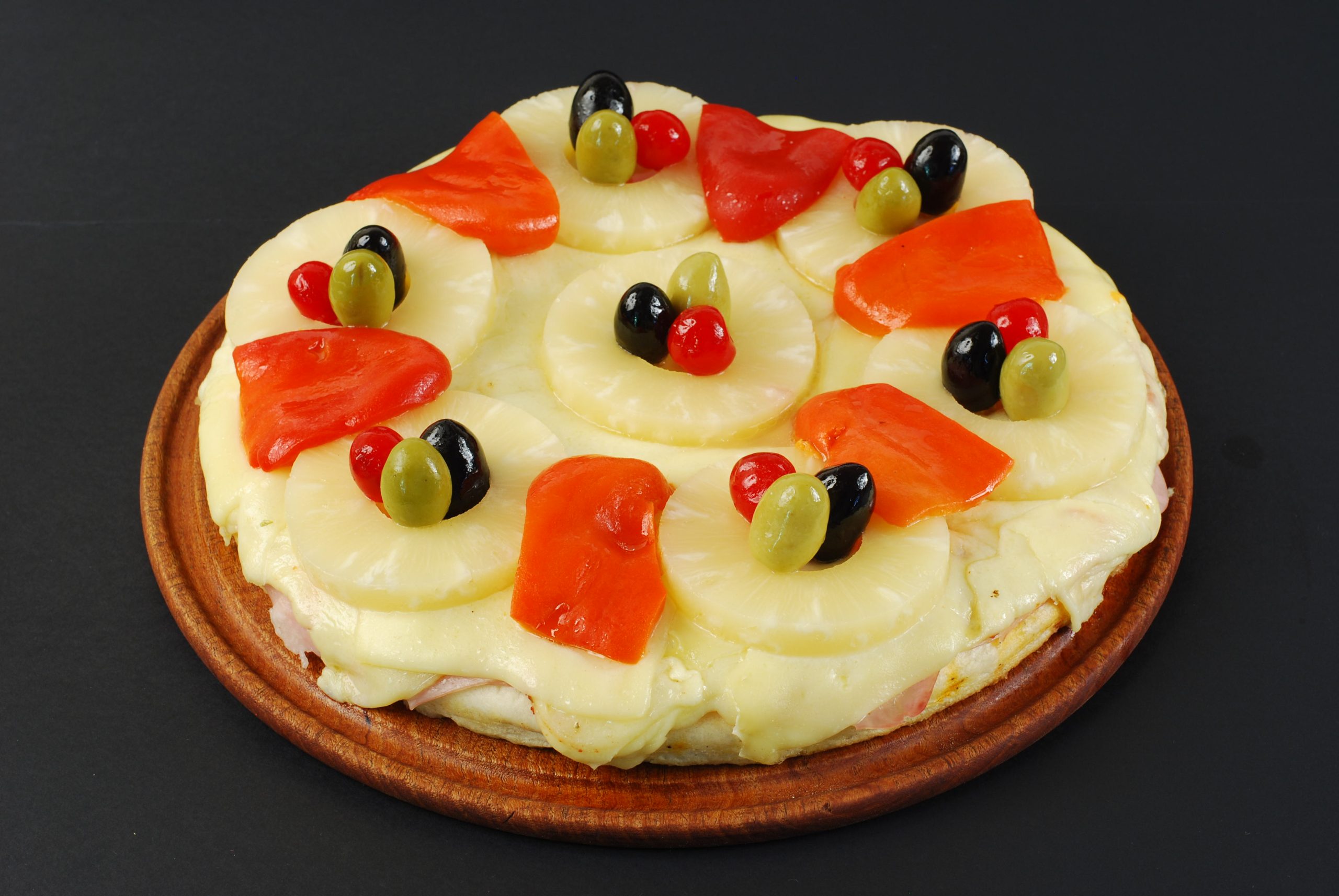 Muzzarella, jamón , ananá en rodajas, cerezas, salsa de tomate, morrones, y aceitunas.